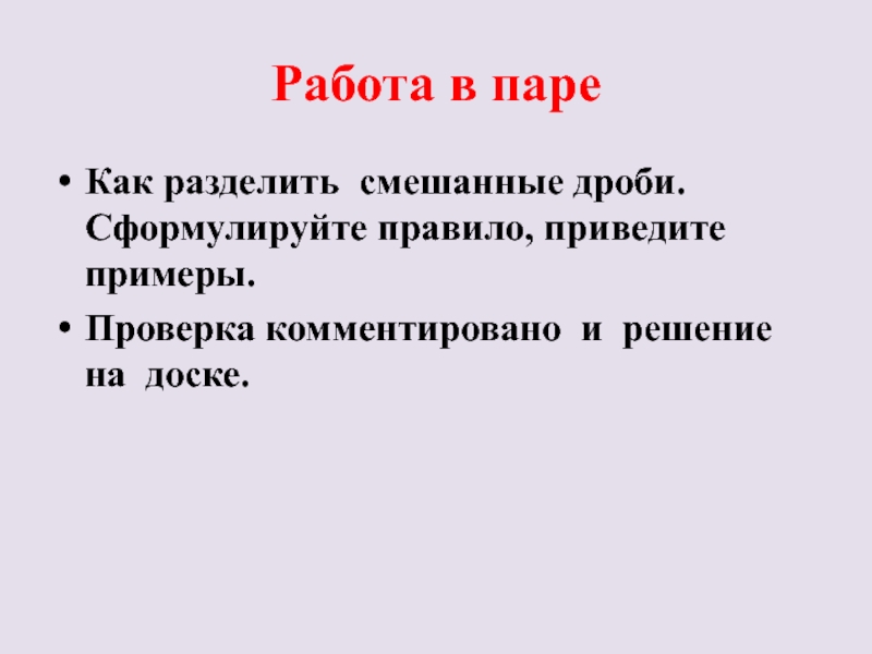 Работа в пареКак разделить смешанные дроби. Сформулируйте правило, приведите примеры.Проверка комментировано и решение на доске.