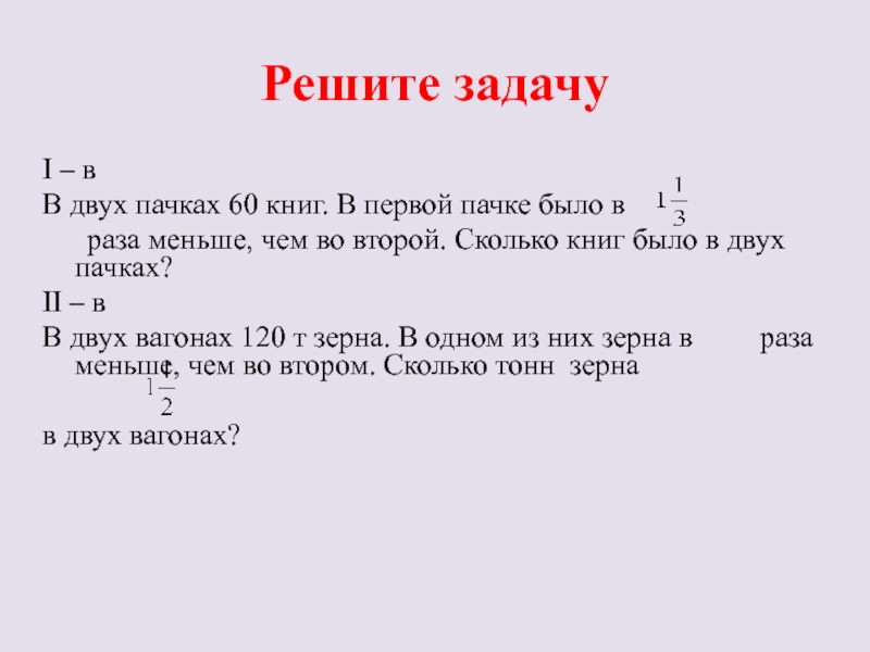 Решите задачуI – вВ двух пачках 60 книг. В первой пачке было в   раза меньше,