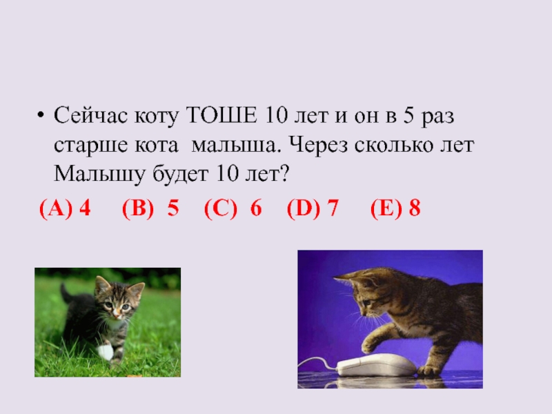 Сейчас коту ТОШЕ 10 лет и он в 5 раз старше кота малыша. Через сколько лет Малышу