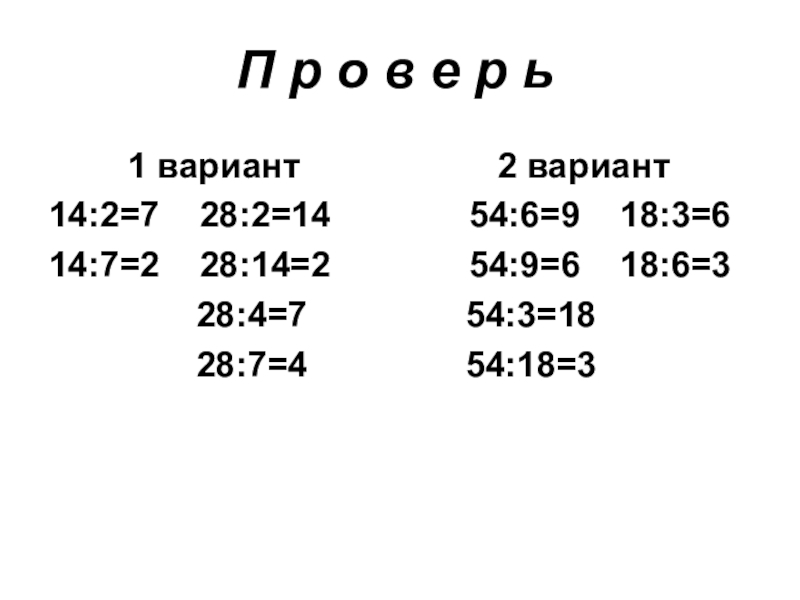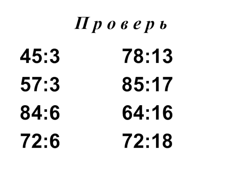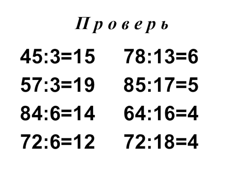 П р о в е р ь 45:3=15   78:13=6 57:3=19   85:17=5 84:6=14
