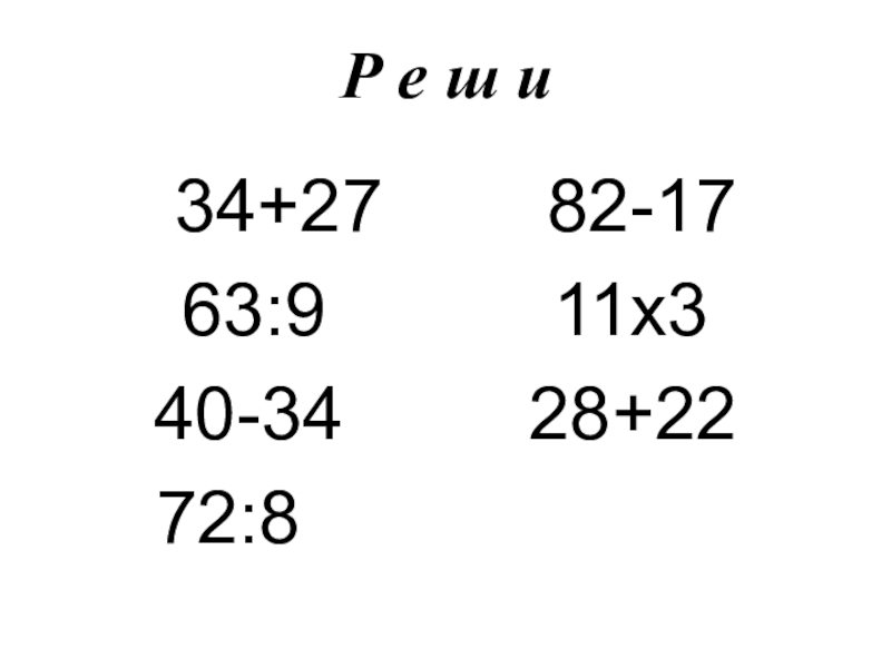 Р е ш и 34+27 82-1763:9 11х340-34 28+22 72:8