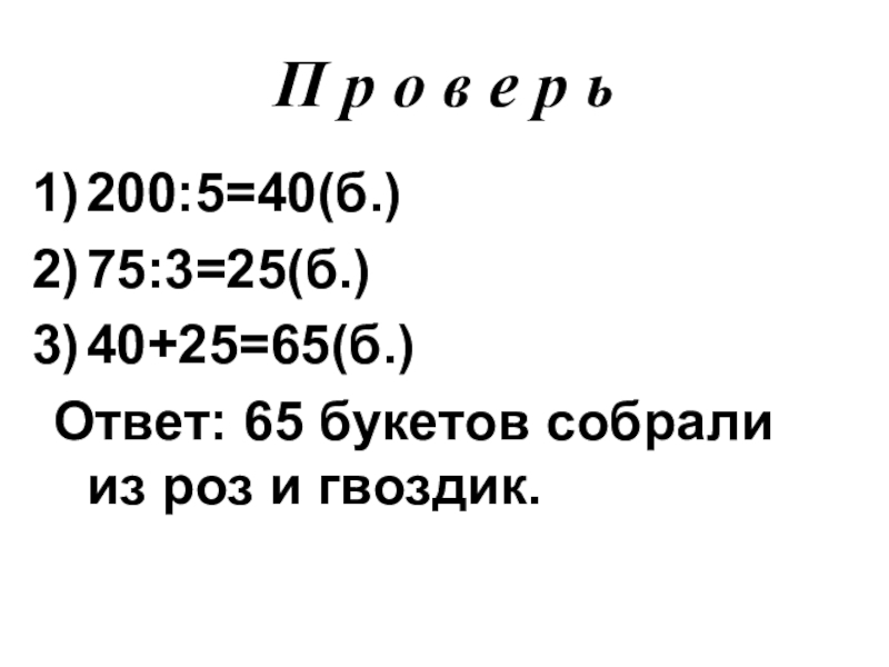 П р о в е р ь200:5=40(б.)75:3=25(б.)40+25=65(б.)Ответ: 65 букетов собрали из роз и гвоздик.