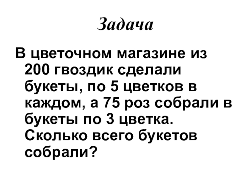 ЗадачаВ цветочном магазине из 200 гвоздик сделали букеты, по 5 цветков в каждом, а 75 роз собрали