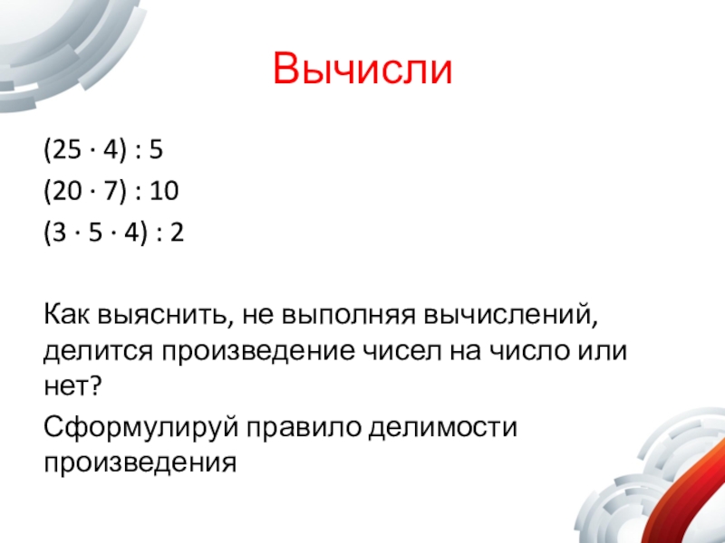 Вычисли(25 ∙ 4) : 5(20 ∙ 7) : 10(3 ∙ 5 ∙ 4) : 2Как выяснить, не выполняя вычислений, делится произведение чисел на число или нет?Сформулируй правило делимости произведения