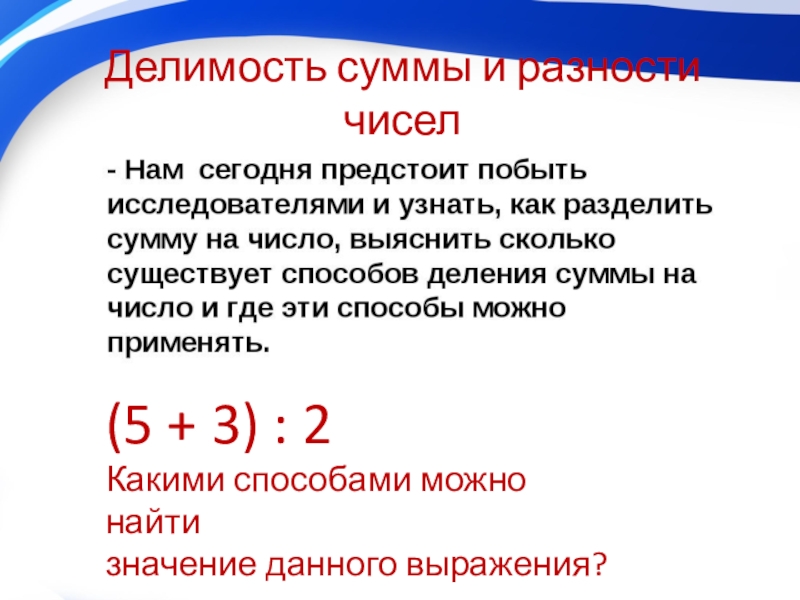 Делимость суммы и разности чисел (5 + 3) : 2Какими способами можно найти значение данного выражения?