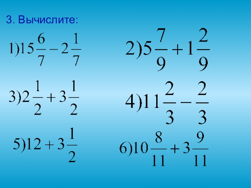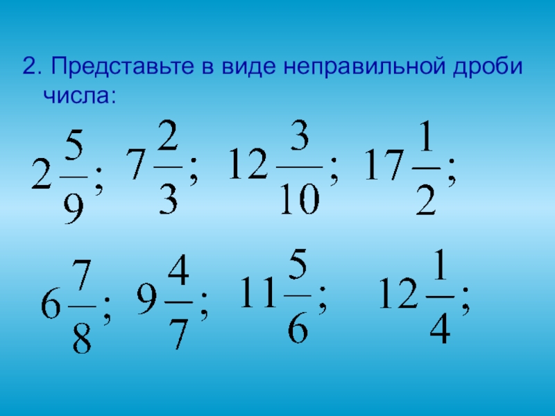 Слайд 22. Представьте в виде неправильной дроби числа: