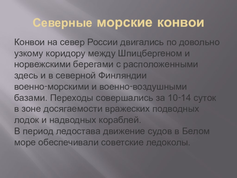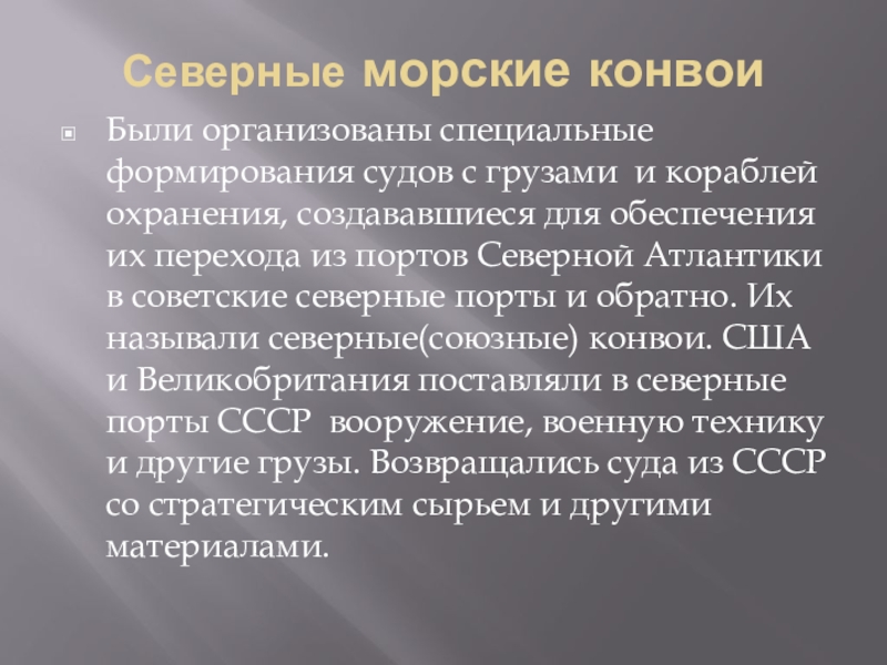 охранения, создававшиеся для обеспечения их перехода из портов Северной Атлантики в советские северные порты и обратно. Их называли северные(союзные) конвои. США и Великобритания поставляли в северные порты СССР вооружение, военную технику и другие грузы. Возвращались суда из СССР со стратегическим сырьем и другими материалами.