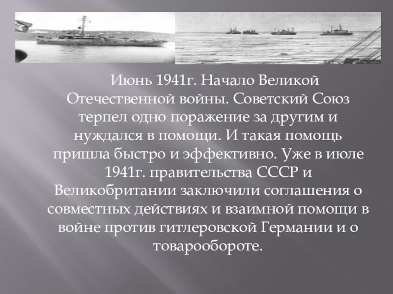 Союз терпел одно поражение за другим и нуждался в помощи. И такая помощь пришла быстро и эффективно. Уже в июле 1941г. правительства СССР и Великобритании заключили соглашения о совместных действиях и взаимной помощи в войне против гитлеровской Германии и о товарообороте.