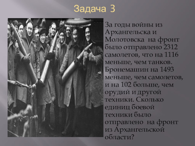 отправлено 2312 самолетов, что на 1116 меньше, чем танков. Бронемашин на 1493 меньше, чем самолетов, и на 102 больше, чем орудий и другой техники. Сколько единиц боевой техники было отправлено на фронт из Архангельской области?