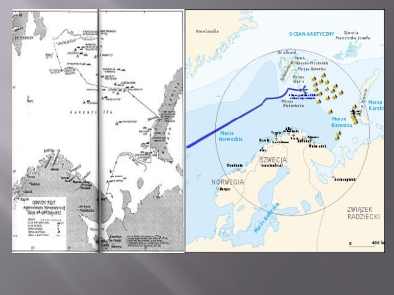 между Шпицбергеном и норвежскими берегами с расположенными здесь и в северной Финляндии военно‑морскими и военно‑воздушными базами. Переходы совершались за 10‑14 суток в зоне досягаемости вражеских подводных лодок и надводных кораблей.