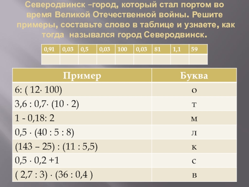 примеры, составьте слово в таблице и узнаете, как тогда назывался город Северодвинск.