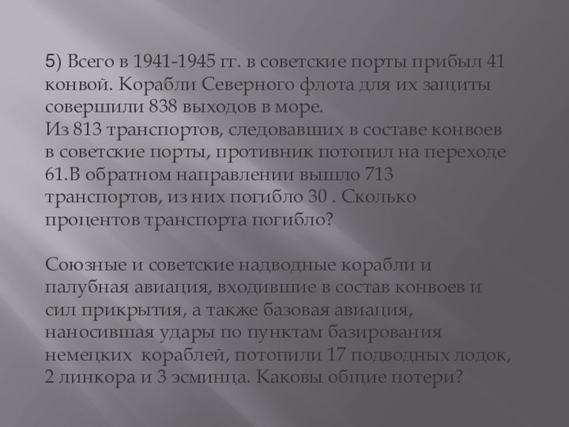 Из 813 транспортов, следовавших в составе конвоев в советские порты, противник потопил на переходе 61.В обратном направлении вышло 713 транспортов, из них погибло 30 . Сколько процентов транспорта погибло?