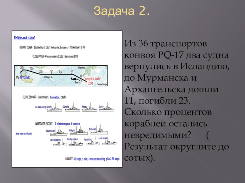 до Мурманска и Архангельска дошли 11, погибли 23. Сколько процентов кораблей остались невредимыми? ( Результат округлите до сотых).