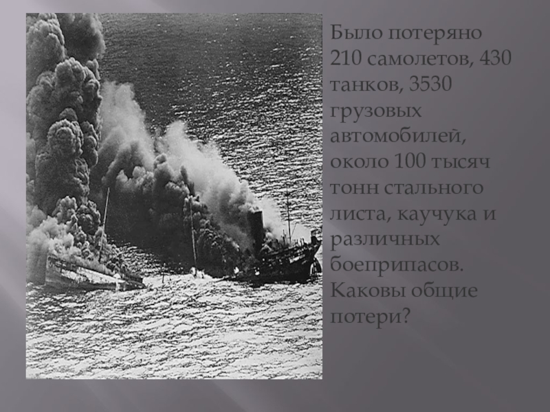 Слайд 11Было потеряно 210 самолетов, 430 танков, 3530 грузовых автомобилей, около 100