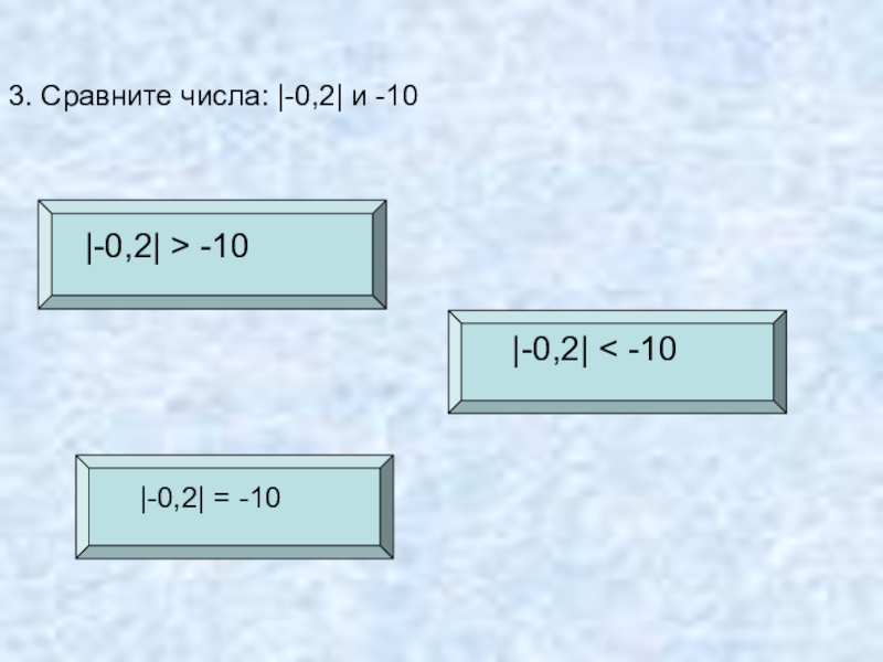 3. Сравните числа: |-0,2| и -10 |-0,2| = -10|-0,2| > -10 |-0,2| < -10