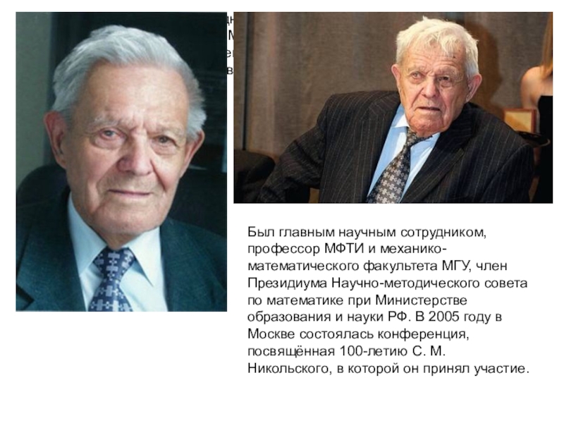 Был главным научным сотрудником, профессор МФТИ и механико-математического факультета МГУ, член Президиума Научно-методического совета по математике при Министерстве образования и науки РФ. В 2005 году в Москве состоялась конференция, посвящённая 100-летию С. М. Никольского, в которой он принял участие.