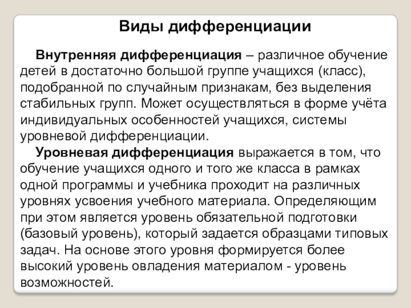 Дифференциация обучения – создание разнообразных условий обучения для различных школ, классов, групп с целью учета особенностей их контингента.