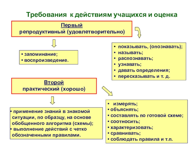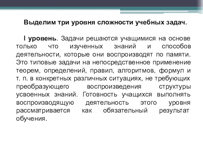 основе только что изученных знаний и способов деятельности, которые они воспроизводят по памяти. Это типовые задачи на непосредственное применение теорем, определений, правил, алгоритмов, формул и т. п. в конкретных различных ситуациях, не требующих преобразующего воспроизведения структуры усвоенных знаний. Готовность учащихся выполнять воспроизводящую деятельность этого уровня рассматривается как обязательный результат обучения.