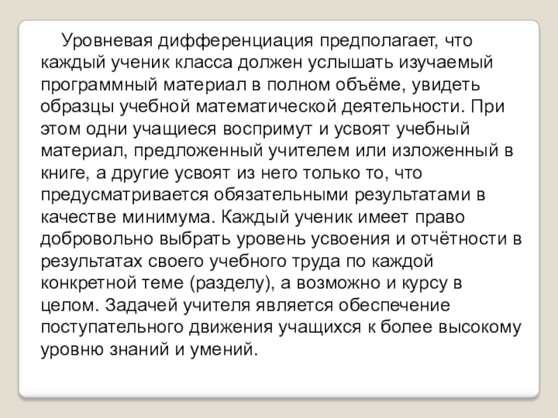 материал в полном объёме, увидеть образцы учебной математической деятельности. При этом одни учащиеся воспримут и усвоят учебный материал, предложенный учителем или изложенный в книге, а другие усвоят из него только то, что предусматривается обязательными результатами в качестве минимума. Каждый ученик имеет право добровольно выбрать уровень усвоения и отчётности в результатах своего учебного труда по каждой конкретной теме (разделу), а возможно и курсу в целом. Задачей учителя является обеспечение поступательного движения учащихся к более высокому уровню знаний и умений.