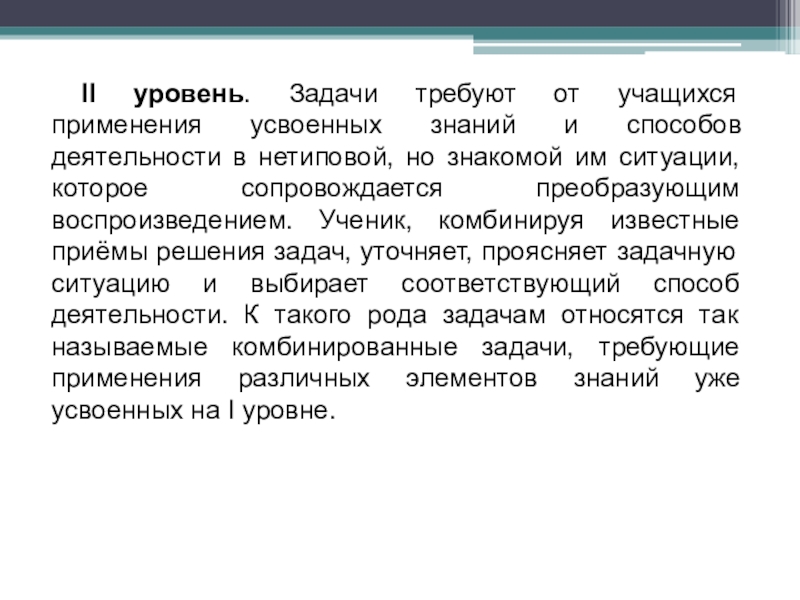 деятельности в нетиповой, но знакомой им ситуации, которое сопровождается преобразующим воспроизведением. Ученик, комбинируя известные приёмы решения задач, уточняет, проясняет задачную ситуацию и выбирает соответствующий способ деятельности. К такого рода задачам относятся так называемые комбинированные задачи, требующие применения различных элементов знаний уже усвоенных на I уровне.
