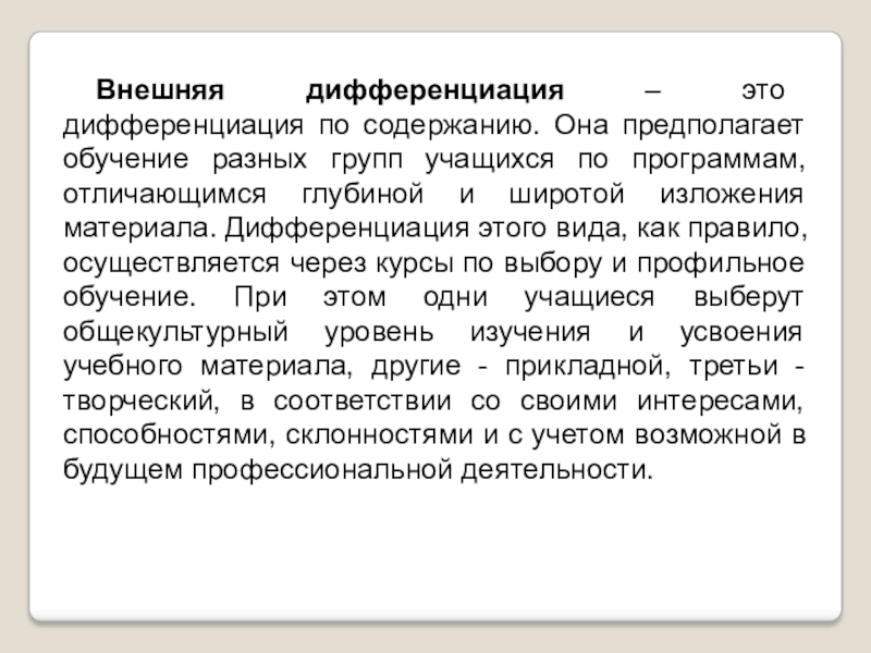 Слайд 5Внешняя дифференциация – это дифференциация по содержанию. Она предполагает обучение разных