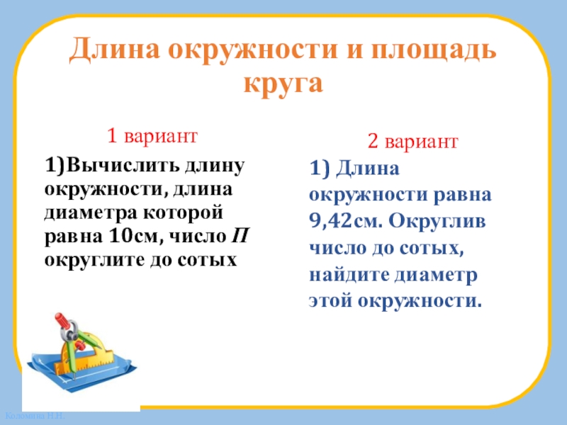 1) Длина окружности равна 9,42см. Округлив число до сотых, найдите диаметр этой окружности.