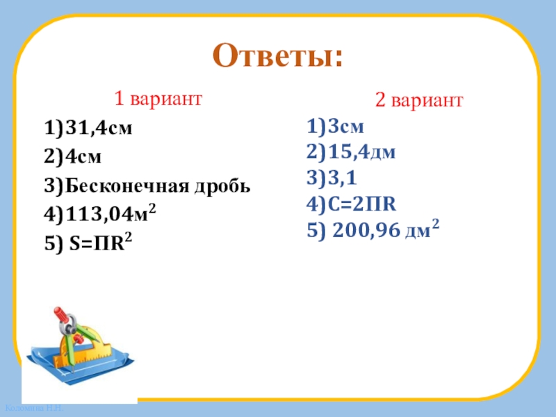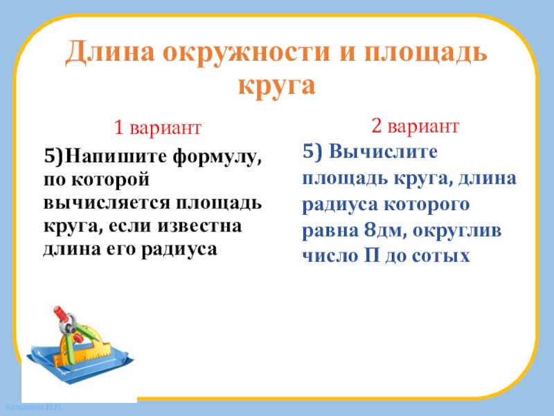 5) Вычислите площадь круга, длина радиуса которого равна 8дм, округлив число П до сотых