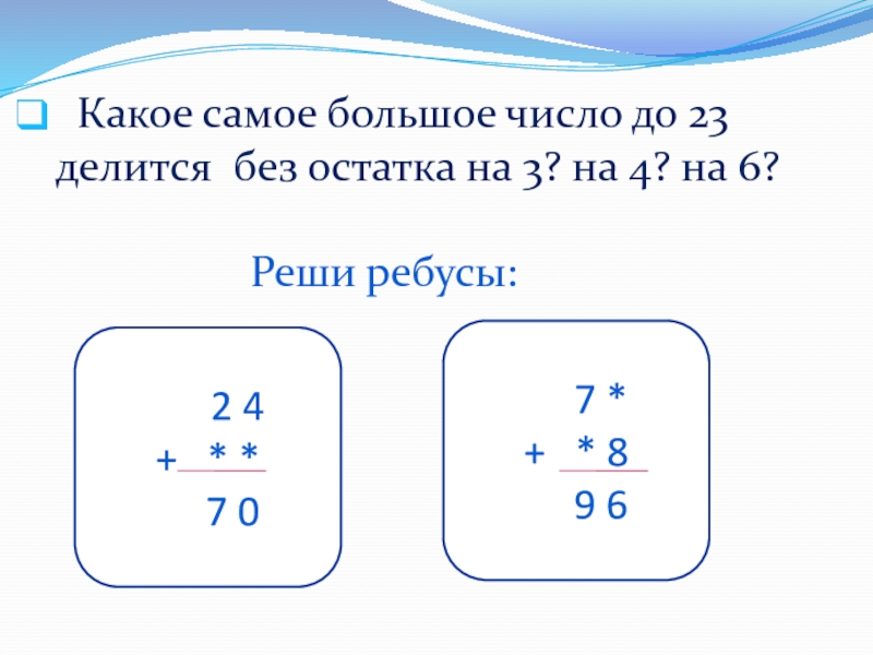 Какое самое большое число до 23 делится без остатка на 3? на 4? на 6?
