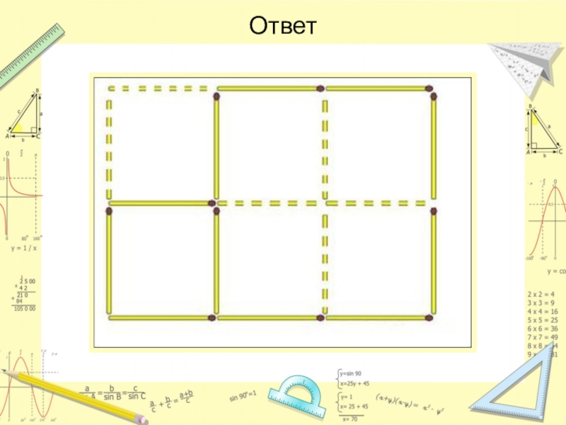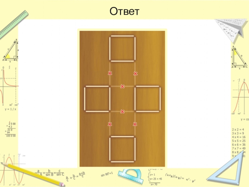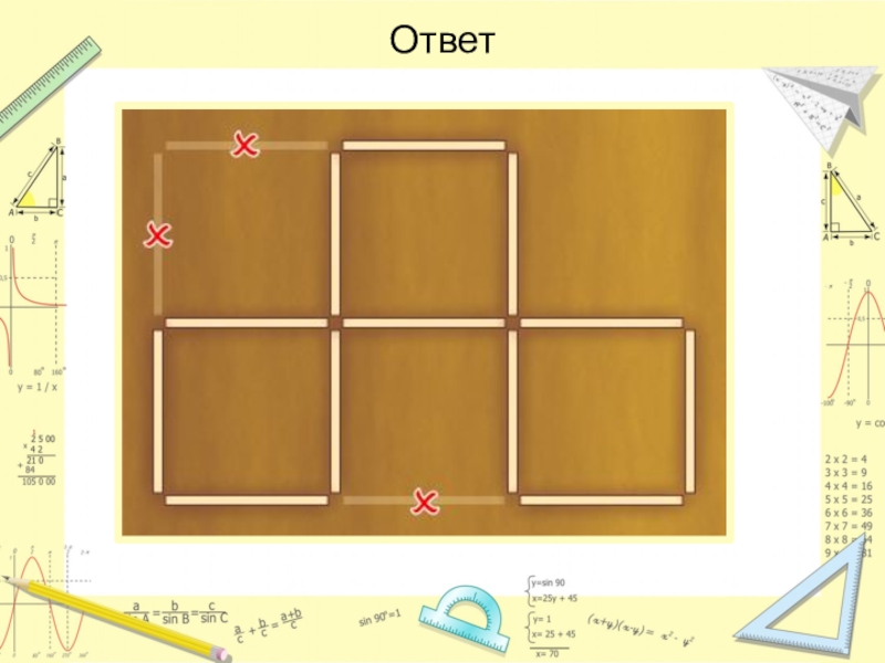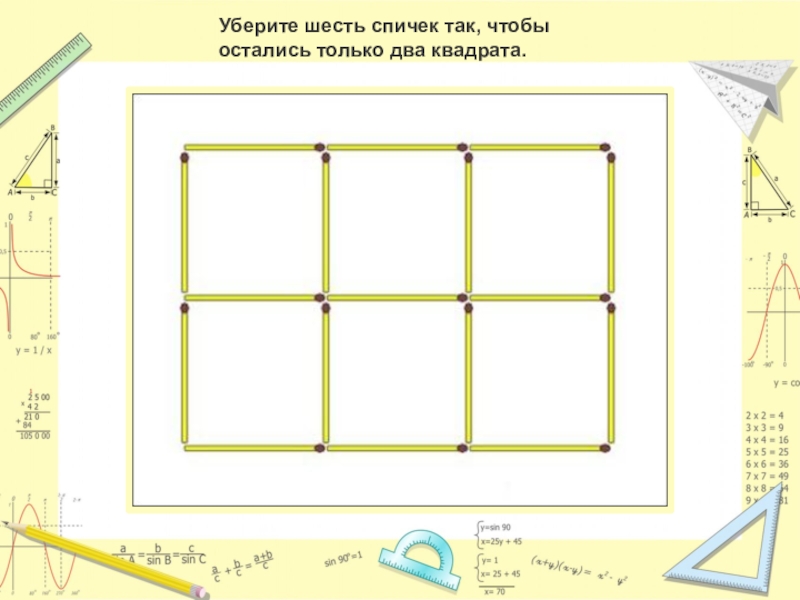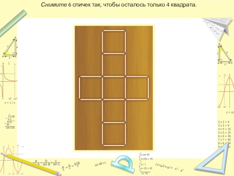 Слайд 20Снимите 6 спичек так, чтобы осталось только 4 квадрата.