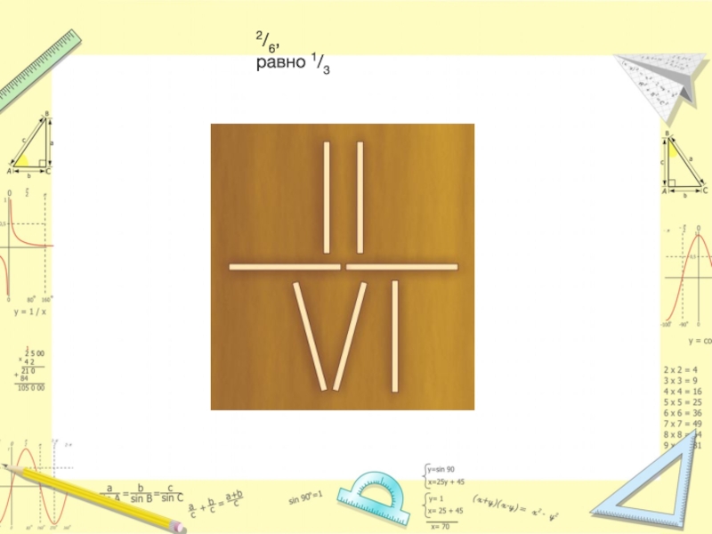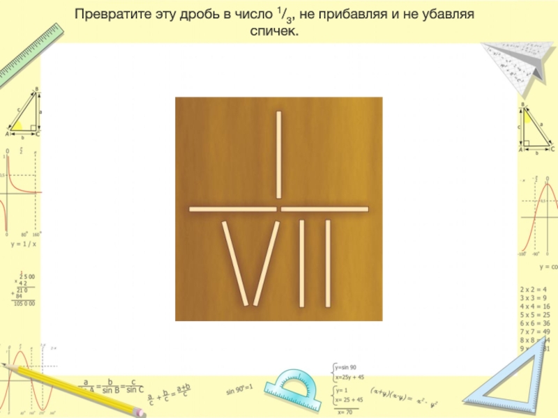 Слайд 34Превратите эту дробь в число 1/3, не прибавляя и не убавляя спичек.