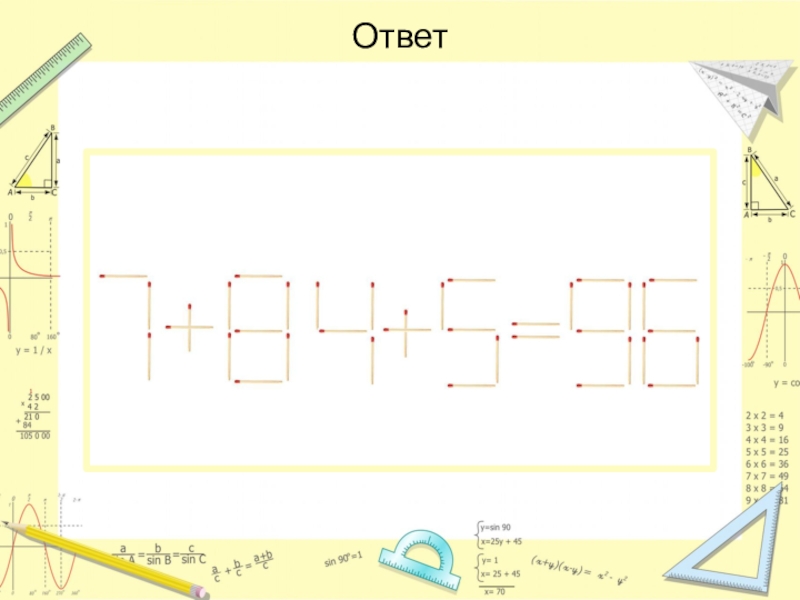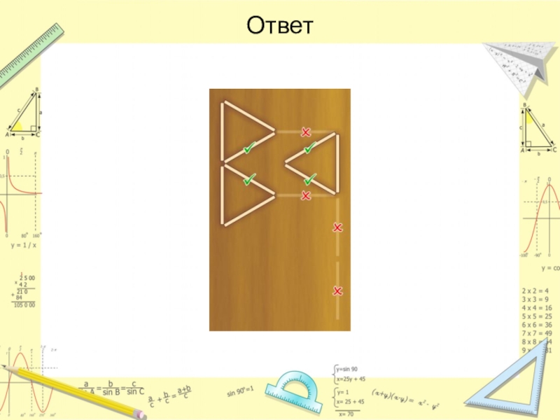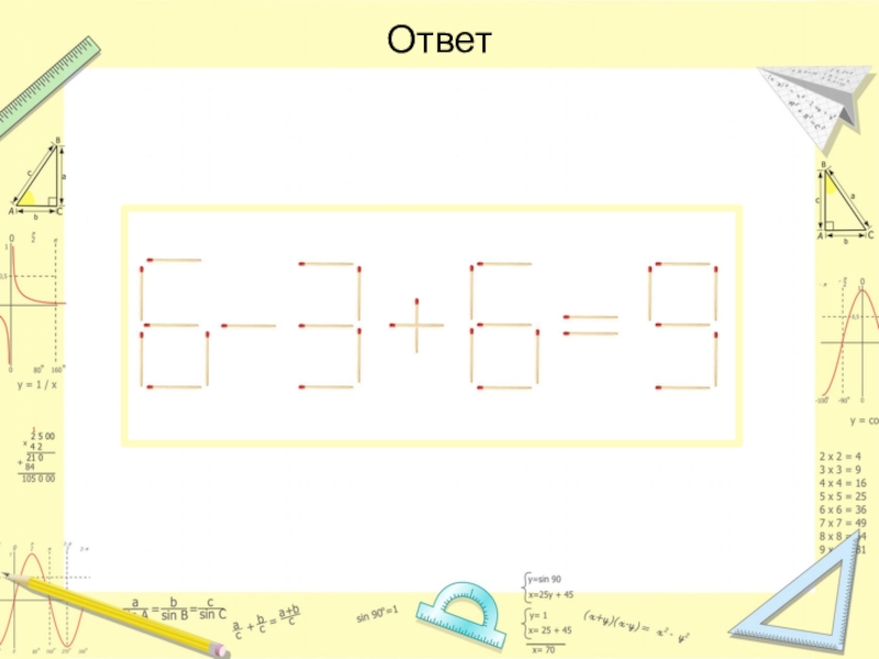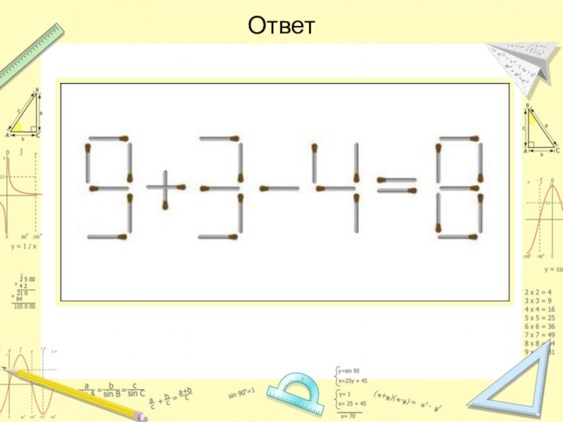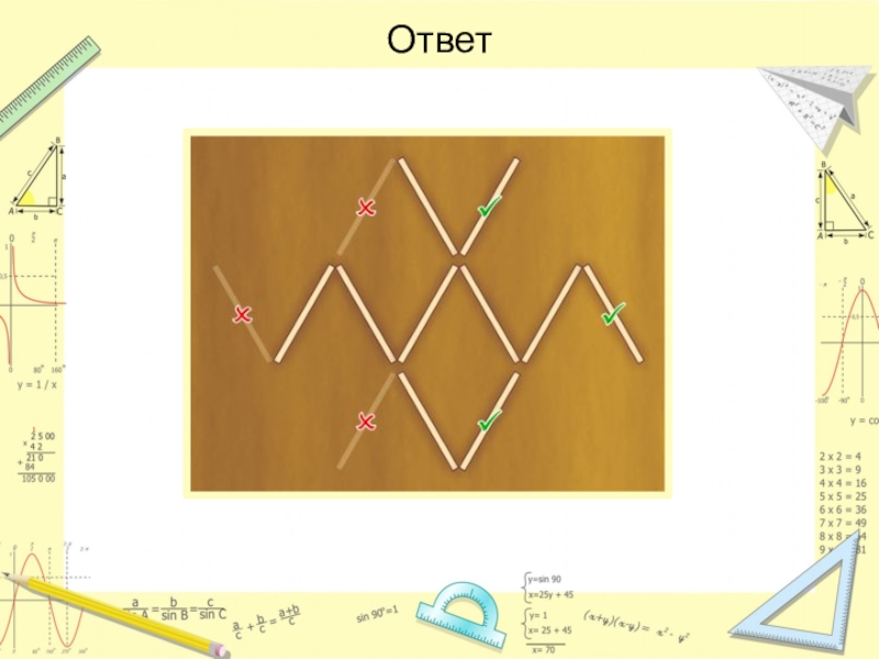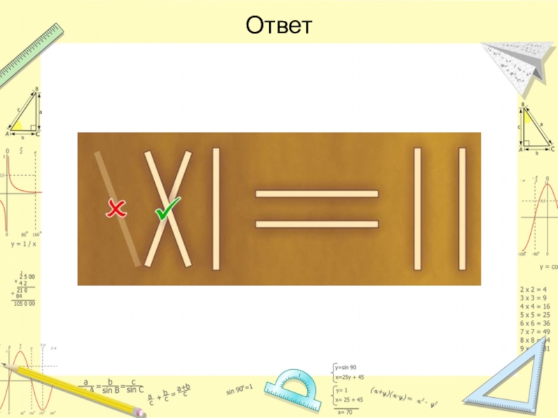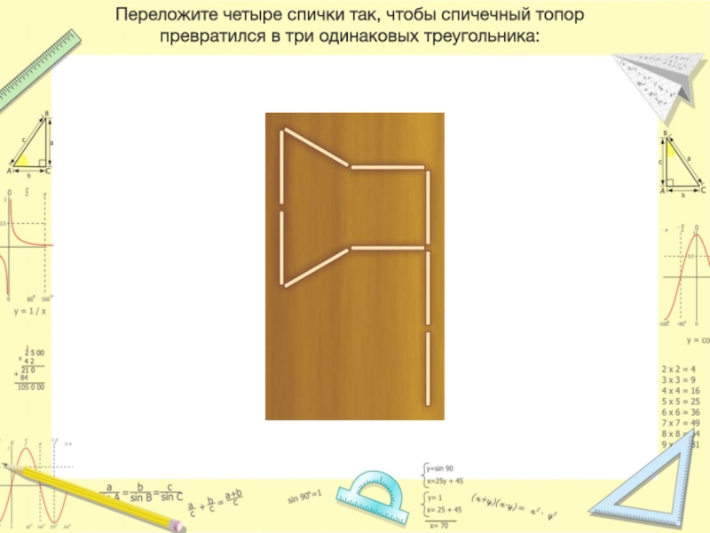 Слайд 36Переложите четыре спички так, чтобы спичечный топор превратился в три одинаковых