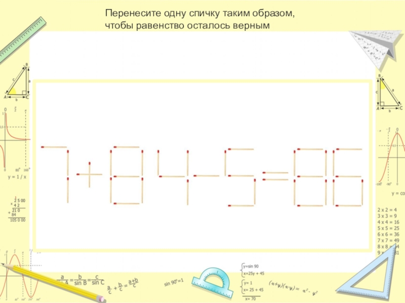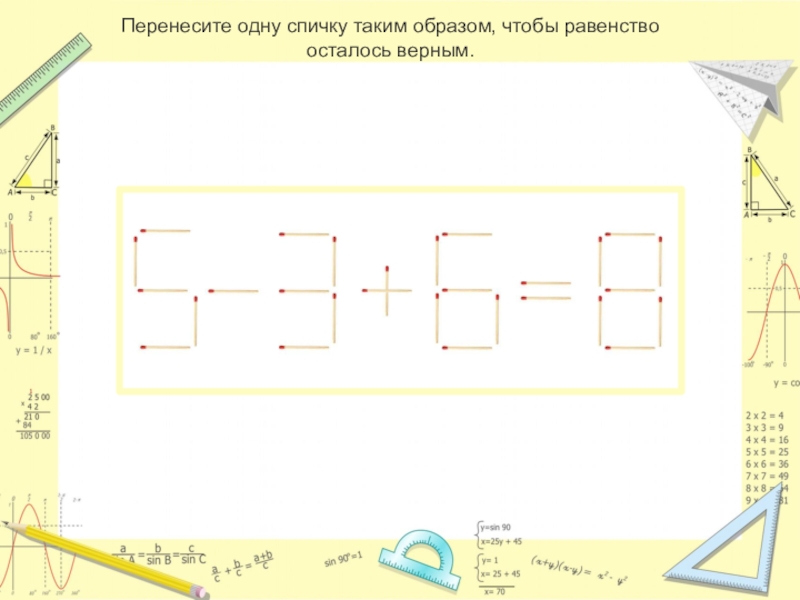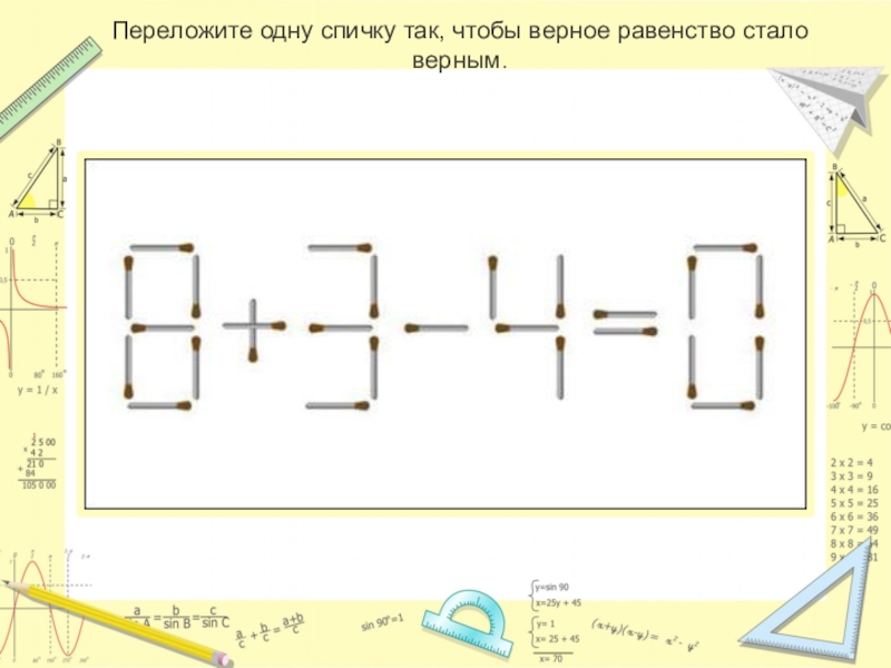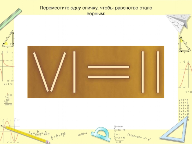 Слайд 14Перенесите одну спичку таким образом, чтобы равенство осталось верным.
