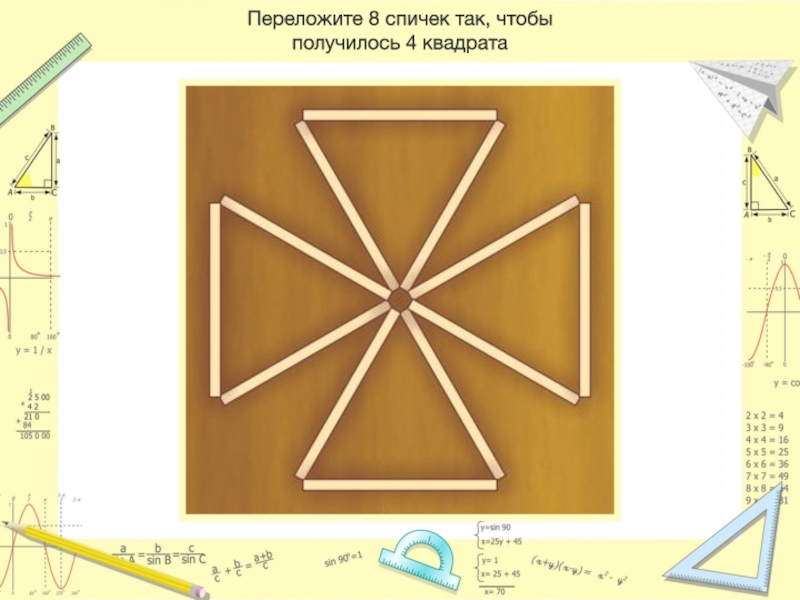 Слайд 30Переложите 8 спичек так, чтобы получилось 4 квадрата