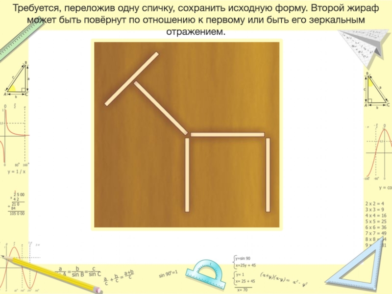 Слайд 32Требуется, переложив одну спичку, сохранить исходную форму. Второй жираф может быть