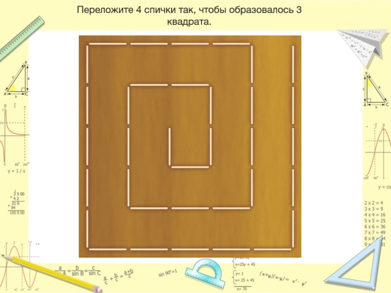Слайд 38Переложите 4 спички так, чтобы образовалось 3 квадрата.