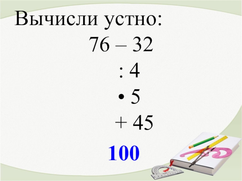 Вычисли устно:76 – 32  : 4  • 5   + 45 100