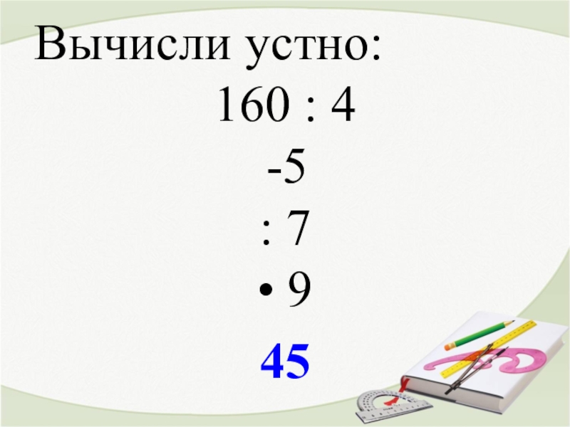 Вычисли устно:160 : 45 : 7 • 945
