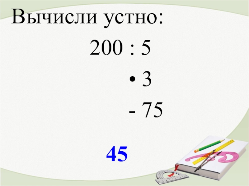 45Вычисли устно:200 : 5    • 3     - 75