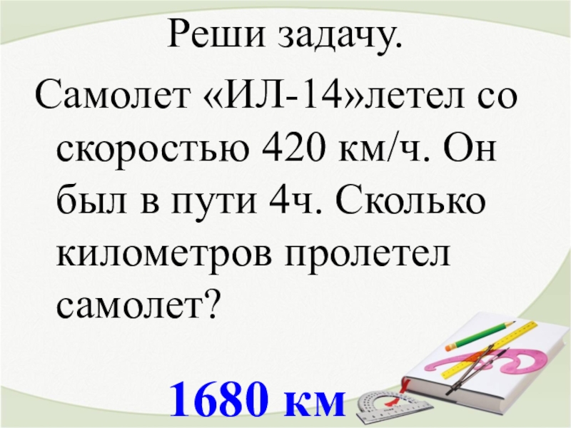 1680 кмРеши задачу.Самолет «ИЛ-14»летел со скоростью 420 км/ч. Он был в пути 4ч. Сколько километров пролетел самолет?