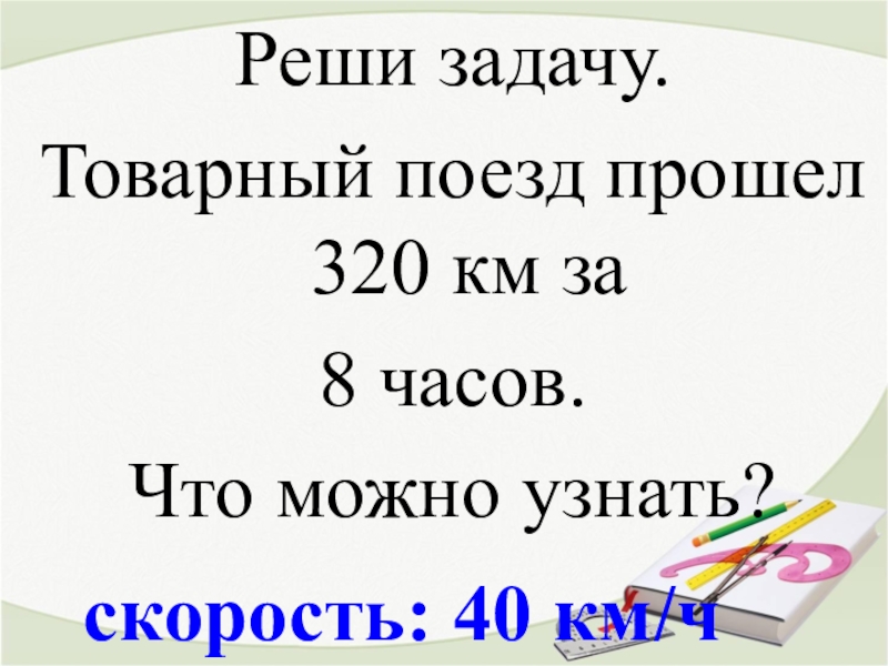 скорость: 40 км/чРеши задачу.Товарный поезд прошел 320 км за 8 часов. Что можно узнать?