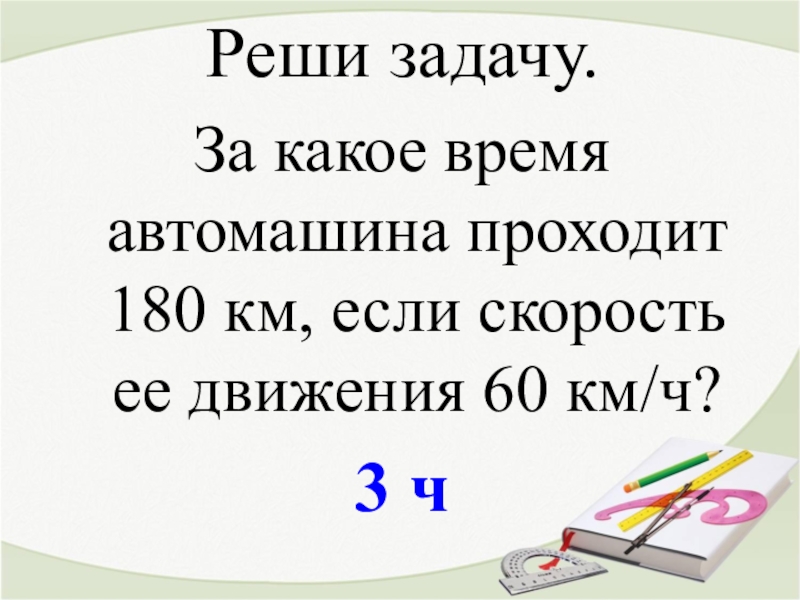Реши задачу.За какое время автомашина проходит 180 км, если скорость ее движения 60 км/ч?3 ч