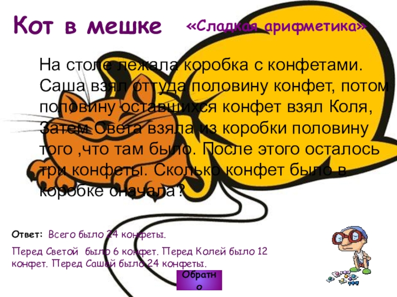 Перед Светой было 6 конфет. Перед Колей было 12 конфет. Перед Сашей было 24 конфеты.
