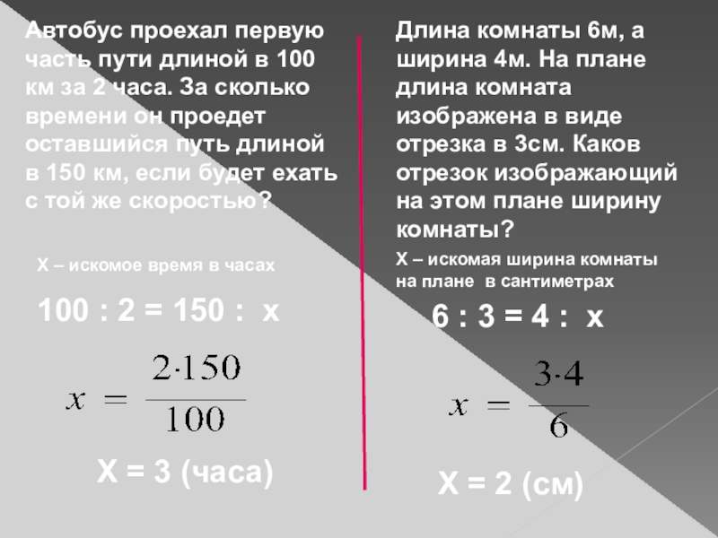 Длина комнаты 6м, а ширина 4м. На плане длина комната изображена в виде отрезка в 3см. Каков отрезок изображающий на этом плане ширину комнаты?