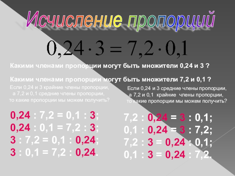 Какими членами пропорции могут быть множители 7,2 и 0,1 ?