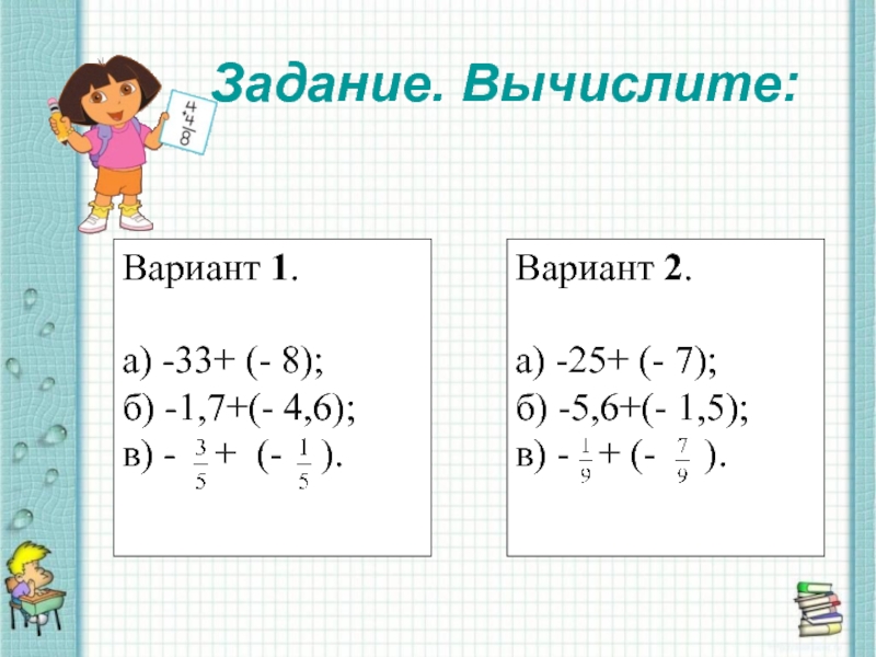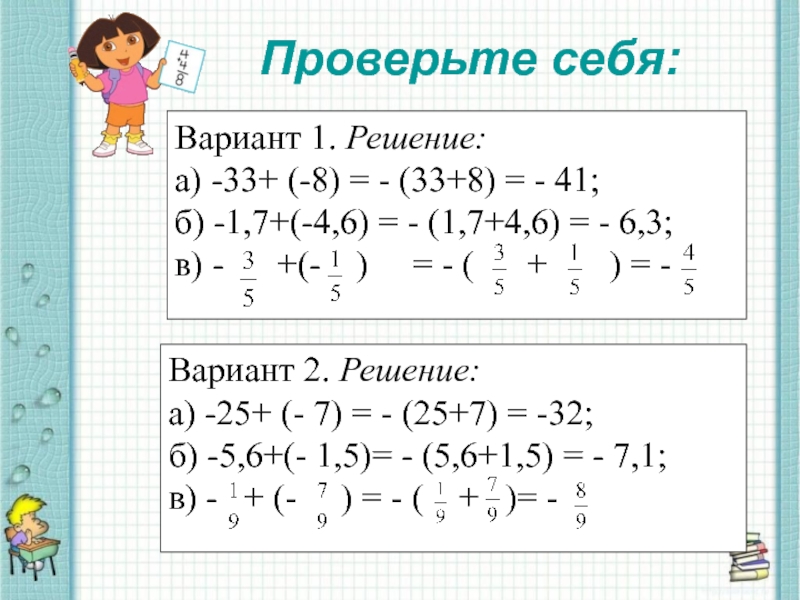 б) -5,6+(- 1,5)= - (5,6+1,5) = - 7,1;