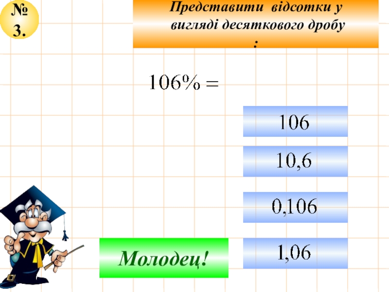 № 3.Представити відсотки у вигляді десяткового дробу:Не верно!Молодец!