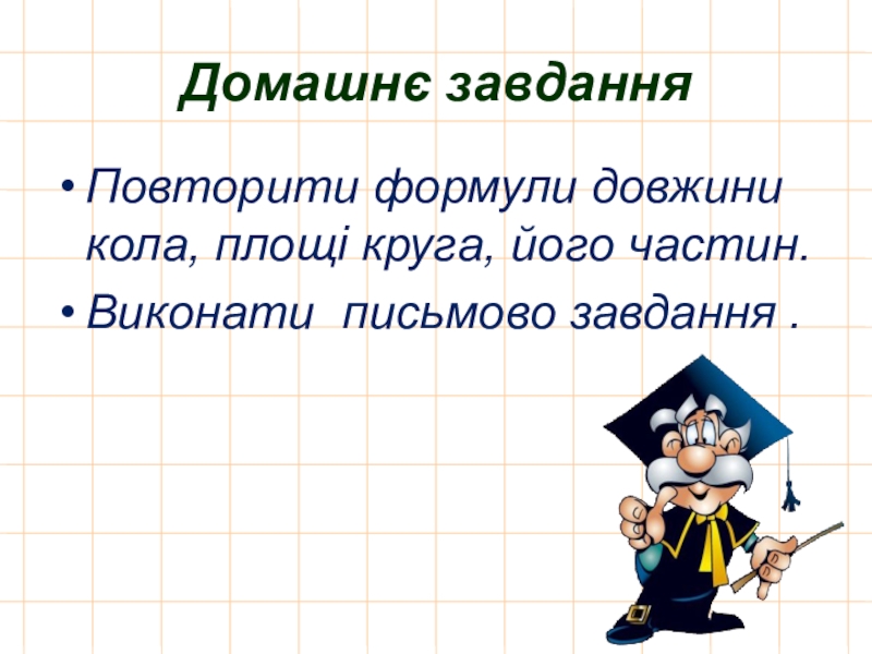 Домашнє завданняПовторити формули довжини кола, площі круга, його частин.Виконати письмово завдання .