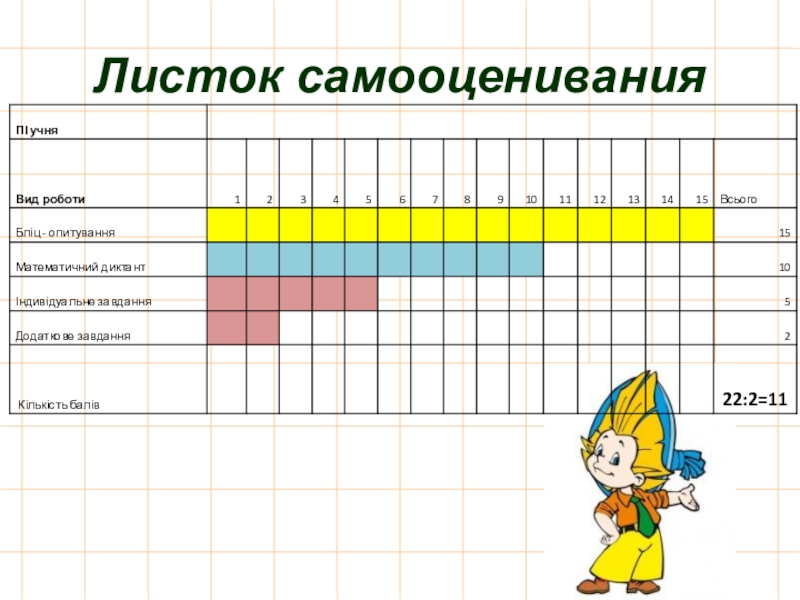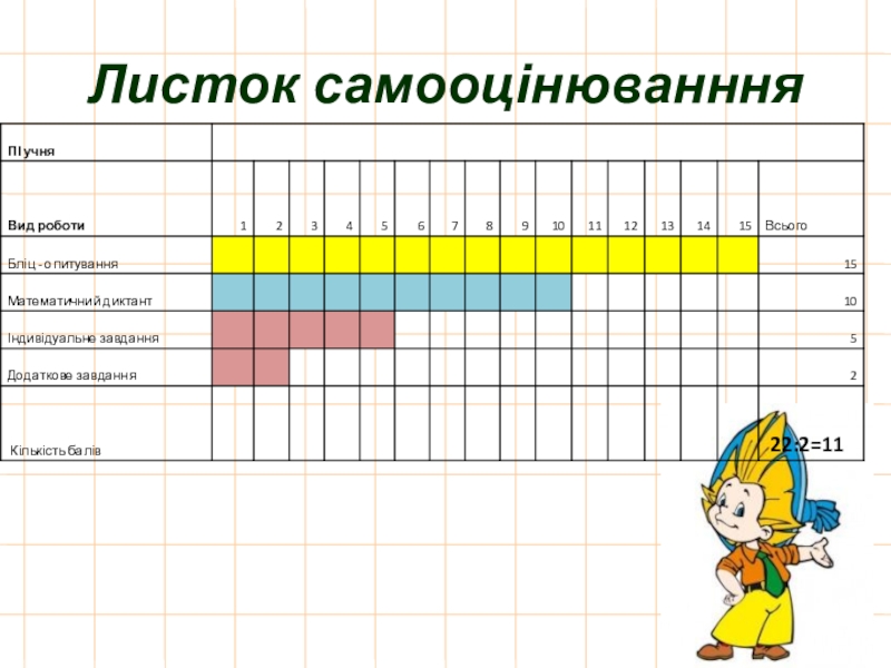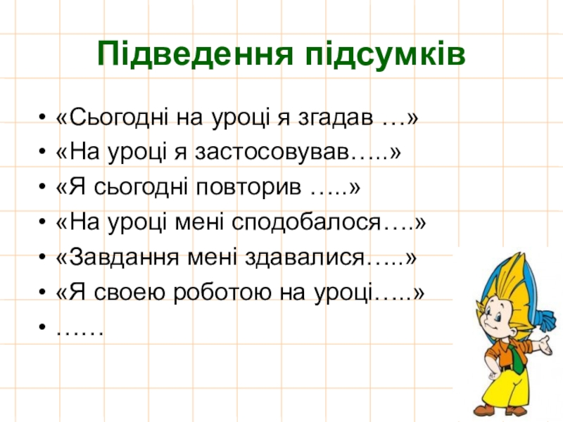 Підведення підсумків«Сьогодні на уроці я згадав …»«На уроці я застосовував…..»«Я сьогодні повторив …..»«На уроці мені сподобалося….»«Завдання мені