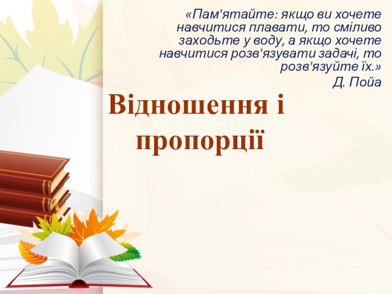 Відношення і пропорції «Пам'ятайте: якщо ви хочете навчитися плавати, то сміливо заходьте у воду, а якщо хочете навчитися розв'язувати задачі, то розв'язуйте їх.» Д. Пойа