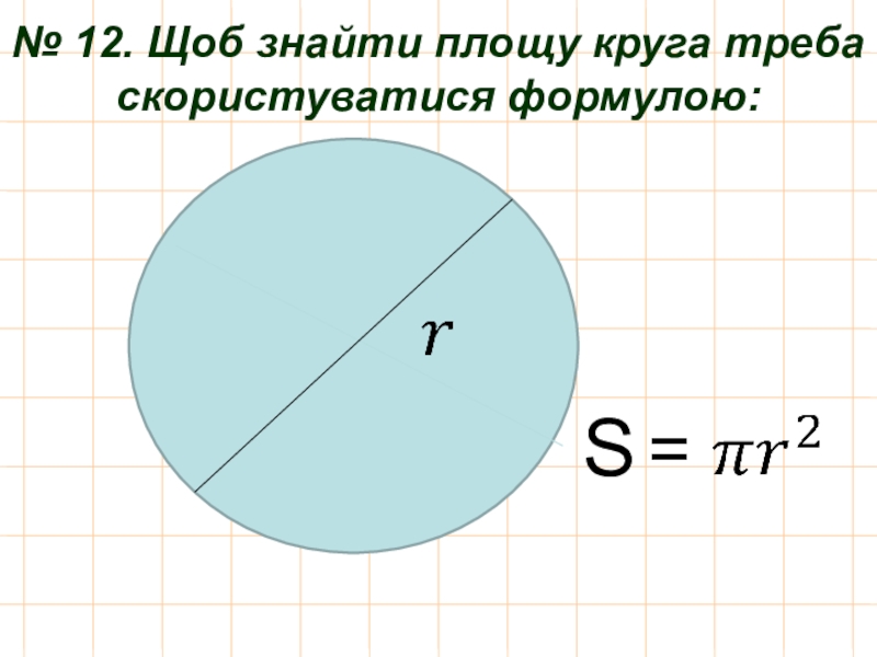 № 12. Щоб знайти площу круга треба скористуватися формулою:
